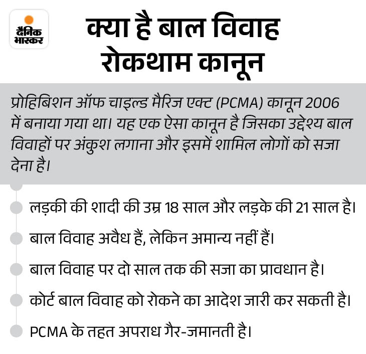 बाल विवाह निषेध अधिनियम 2006 के तहत 18 साल से कम उम्र की लड़की और 21 साल से कम उम्र के लड़के का विवाह करना प्रतिबंधित है। इतना ही नहीं, जो लोग शादी करवाते हैं या उसमें मदद करते हैं, उनके खिलाफ भी कानूनी कार्रवाई की जाती है।