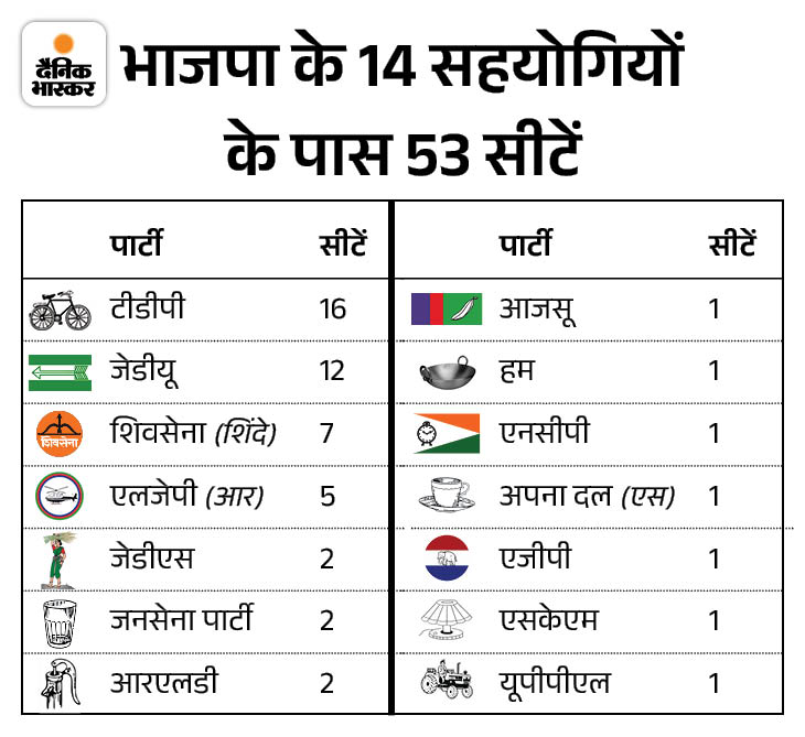 भाजपा को बहुमत नहीं, 14 सहयोगी दलों के 53 सांसदों का समर्थन