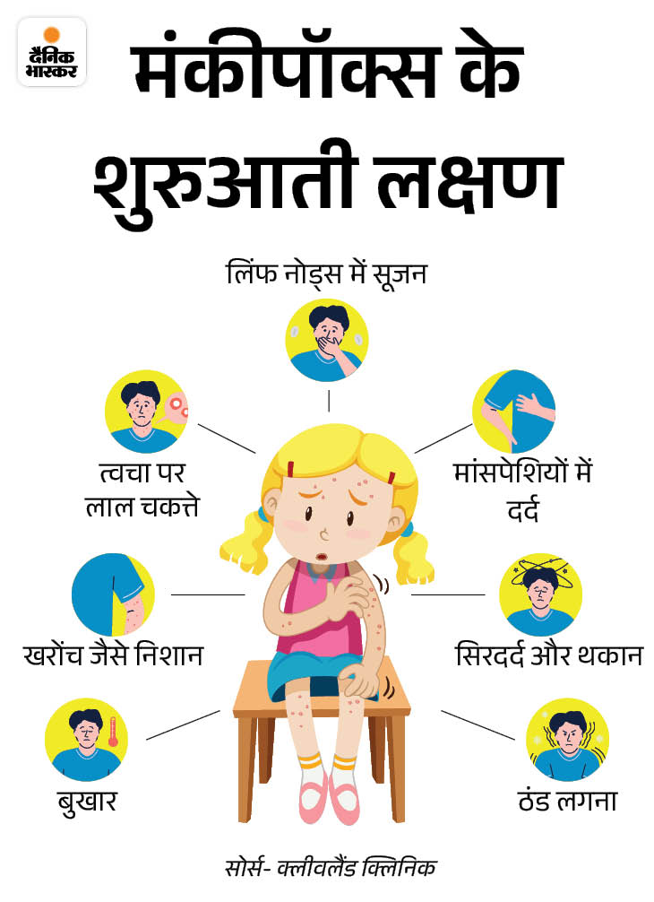 - मंकीपॉक्स का सबसे शुरुआती लक्षण बुखार होता है। फिर बुखार शुरू होने के लगभग 1 से 4 दिन बाद त्वचा पर दाने निकलने शुरू होते हैं।