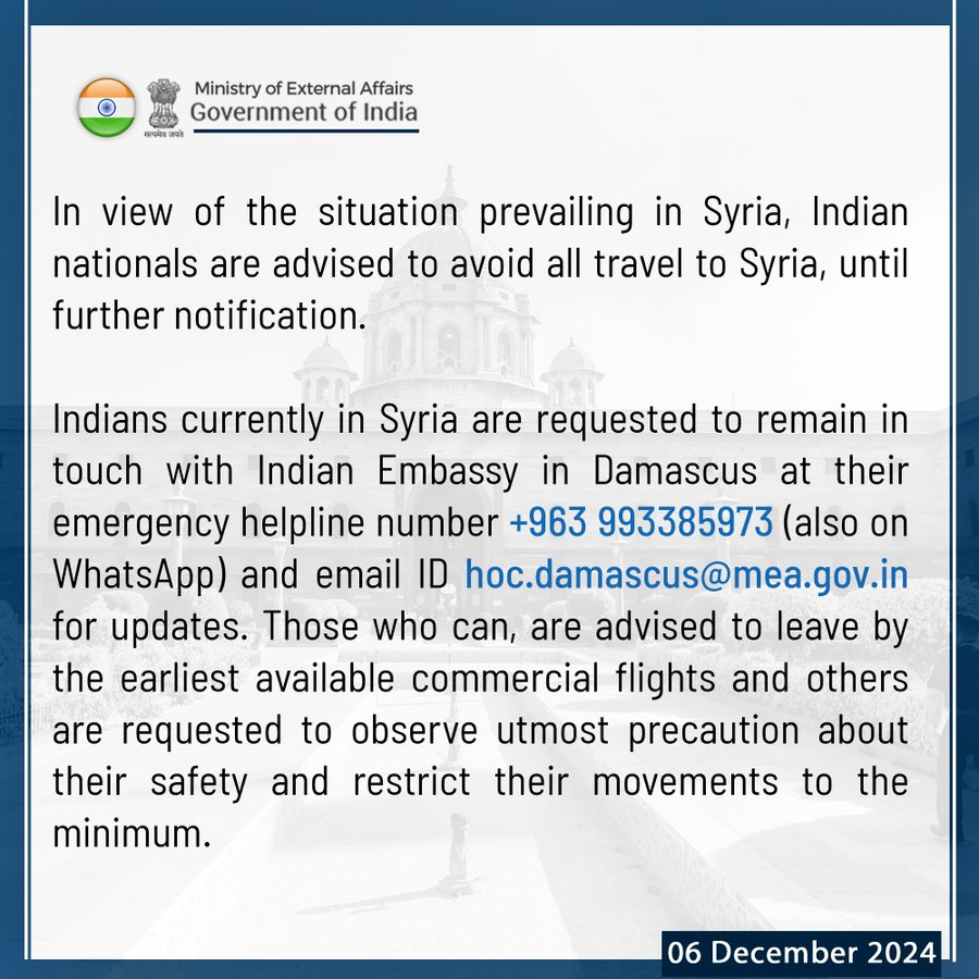 विदेश मंत्रालय ने कहा- सीरिया की मौजूदा स्थिति को देखते हुए भारतीय नागरिकों को अगली सूचना तक सीरिया की यात्रा से बचने की सलाह दी जाती है। वहां रह रहे भारतीय लोगों से अपील की जाती है कि वे बहुत जरूरी होने पर ही बाहर निकलें।