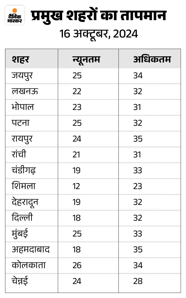 MP में 20 अक्टूबर से ठंड का असर मौसम विभाग के मुताबिक, MP में 20 अक्टूबर से ठंड का असर और बढ़ेगा। हालांकि, दिन का तापमान 33-34°C डिग्री के बीच बना रहेगा। अक्टूबर के आखिरी हफ्ते में दिवाली के करीब तापमान में बड़ी गिरावट आने की संभावना है।