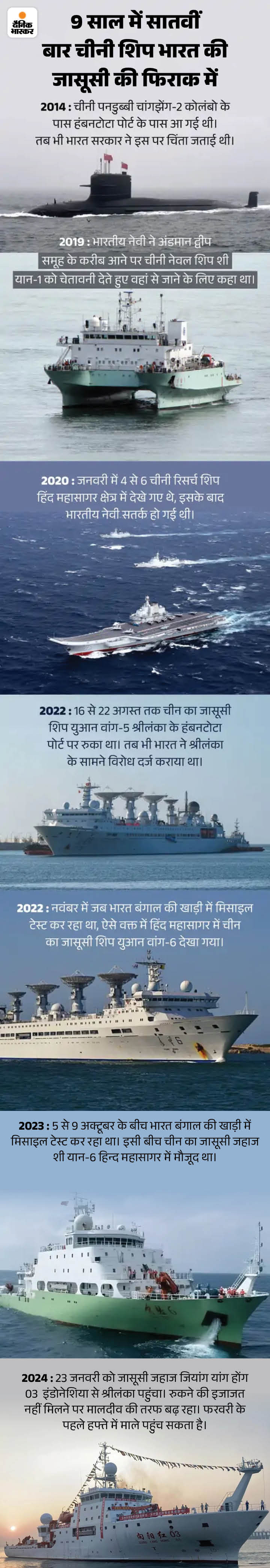 भारतीय नौसेना के एक अधिकारी ने कहा- चीन का खुफिया जहाज जियांग यांग होंग 03 इंडोनेशिया के सुंडा स्ट्रैट से होते हुए हिंद महासागर में घुसा और अब मालदीव की तरफ बढ़ रहा है। यह मालदीव इसलिए जा रहा है क्योंकि श्रीलंका ने इसे अपने किसी भी बंदरगाह पर रुकने की इजाजत नहीं दी। फरवरी के पहले हफ्ते में यह मालदीव की राजधानी माले के बंदरगाह पहुंच सकता है।