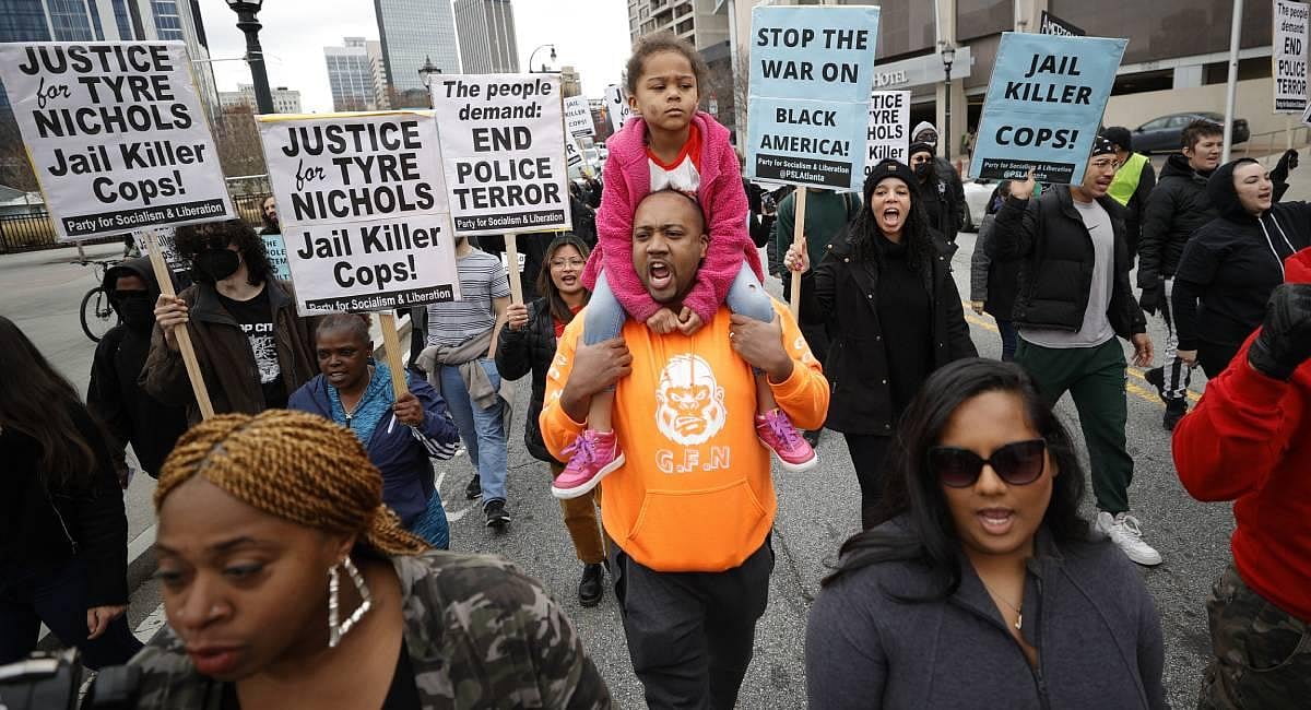 Image shows Tyre Nichols on the ground as medics arrive during a brutal attack by five Memphis police officer. (Photo | AP)The video images released Friday show police savagely beating the 29-year-old FedEx worker for three minutes while screaming profanities at him in an assault that the Nichols family legal team has likened to the infamous 1991 police beating of Los Angeles motorist Rodney King. Nichols calls out for his mother before his limp body is propped against a squad car and the officers exchange fist-bumps. (Photo | AP)This combo of booking images provided shows the five former Memphis police officers have been charged with second-degree murder and other crimes in the arrest and death of Tyre Nichols. (Photo | AP)Rodney Wells, stepfather of Tyre Nichols, who died after being beaten by Memphis police officers, speaks at a news conference with civil rights Attorney Ben Crump, seen comforting Tyre’s mother RowVaughn Wells. (Photo | AP)Demonstrators march during a protest, Saturday, Jan. 28, 2023, in Atlanta, over the death of Tyre Nichols. (Photo | AP)The Memphis police chief disbanded the city’s so-called Scorpion unit on Saturday, citing a “cloud of dishonor” from newly released video that showed some of its officers beating Tyre Nichols to death after stopping the Black motorist. (Photo | AP)Demonstrators march during a protest, over the death of Tyre Nichols, who died after being beaten by Memphis police. (Photo | AP)During a speech Saturday in Harlem, Rev. Al Sharpton said the beating was particularly egregious because the officers were Black, too. “Your Blackness will not stop us from fighting you. These five cops not only disgraced their names, they disgraced our race,” Sharpton said.(Photo | AP)A makeshift memorial is seen where Tyre Nichols was beaten by police and later died, at Bear Creek Cove and Castlegate Lane in Memphis. (Photo | AP)Rodney Wells, Nichols’ stepfather, said the family would “continue to seek justice” and those who failed to render aid are “just as culpable as the officers who threw the blows.” (Photo | AP)