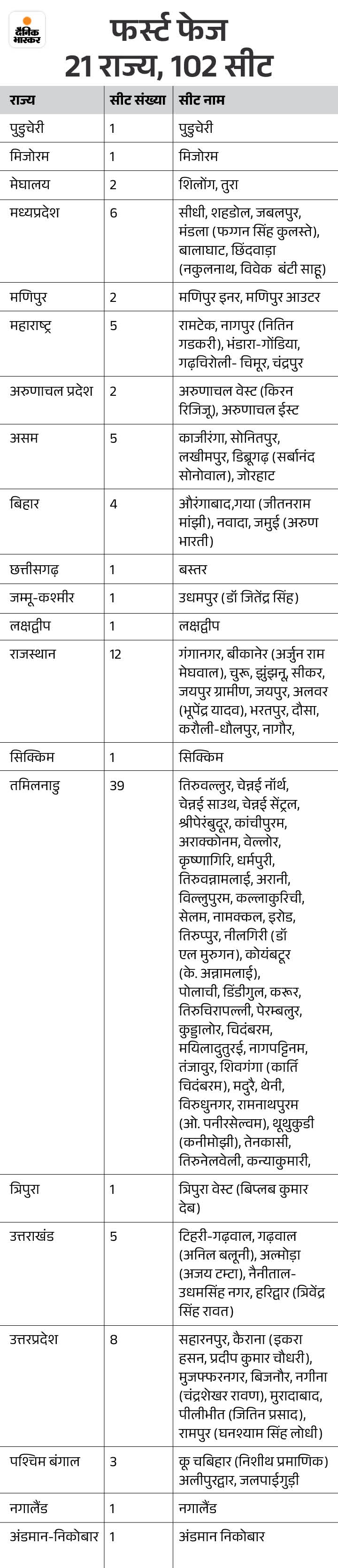 2024 लोकसभा चुनाव के फर्स्ट फेज में गुरुवार यानी 19 अप्रैल को 21 राज्यों और केंद्र शासित प्रदेशों की 102 सीटों पर वोटिंग होगी। 2019 में इन सीटों पर सबसे ज्यादा भाजपा ने 40, DMK ने 24, कांग्रेस ने 15 सीटें जीती थीं। अन्य को 23 सीटें मिली थीं।